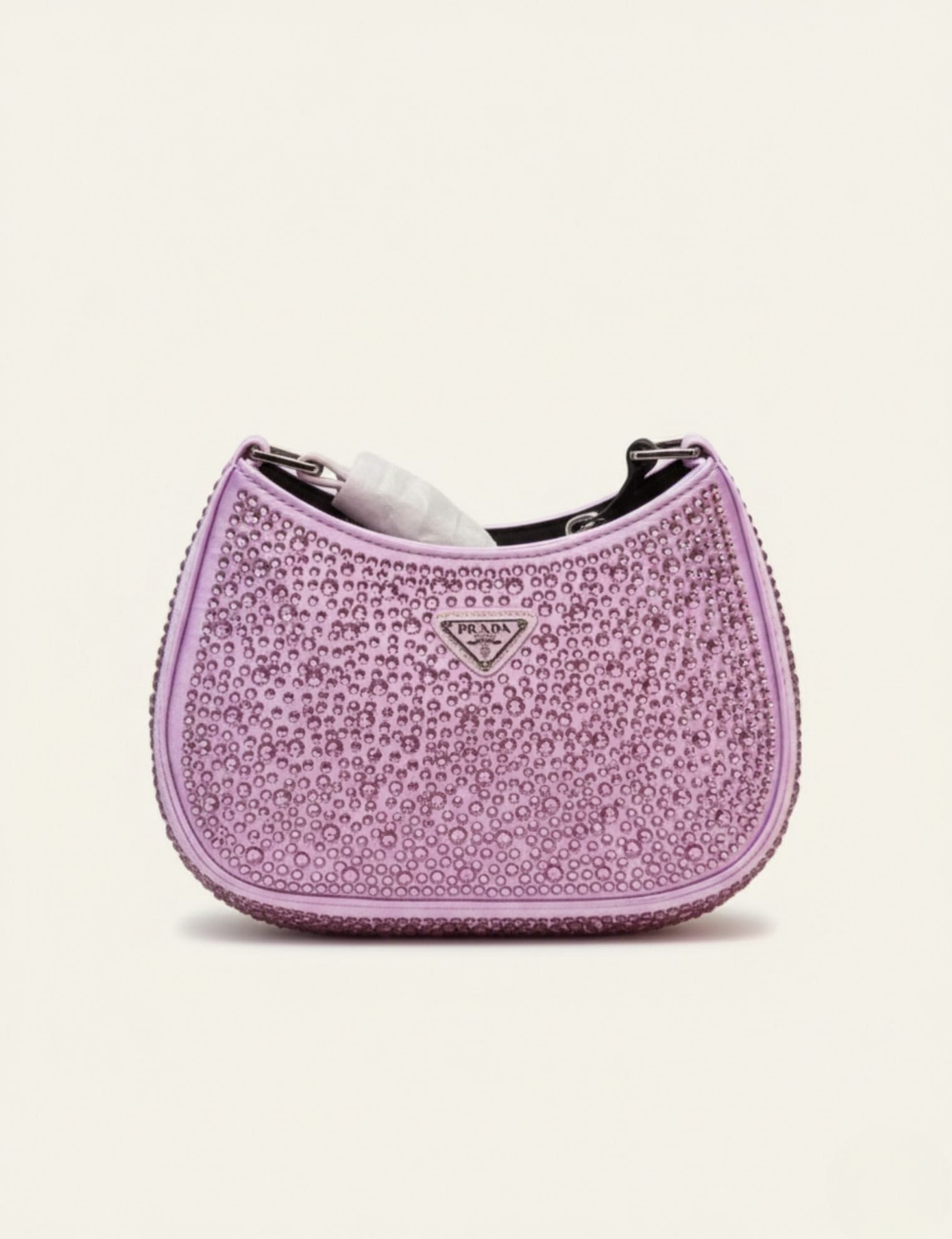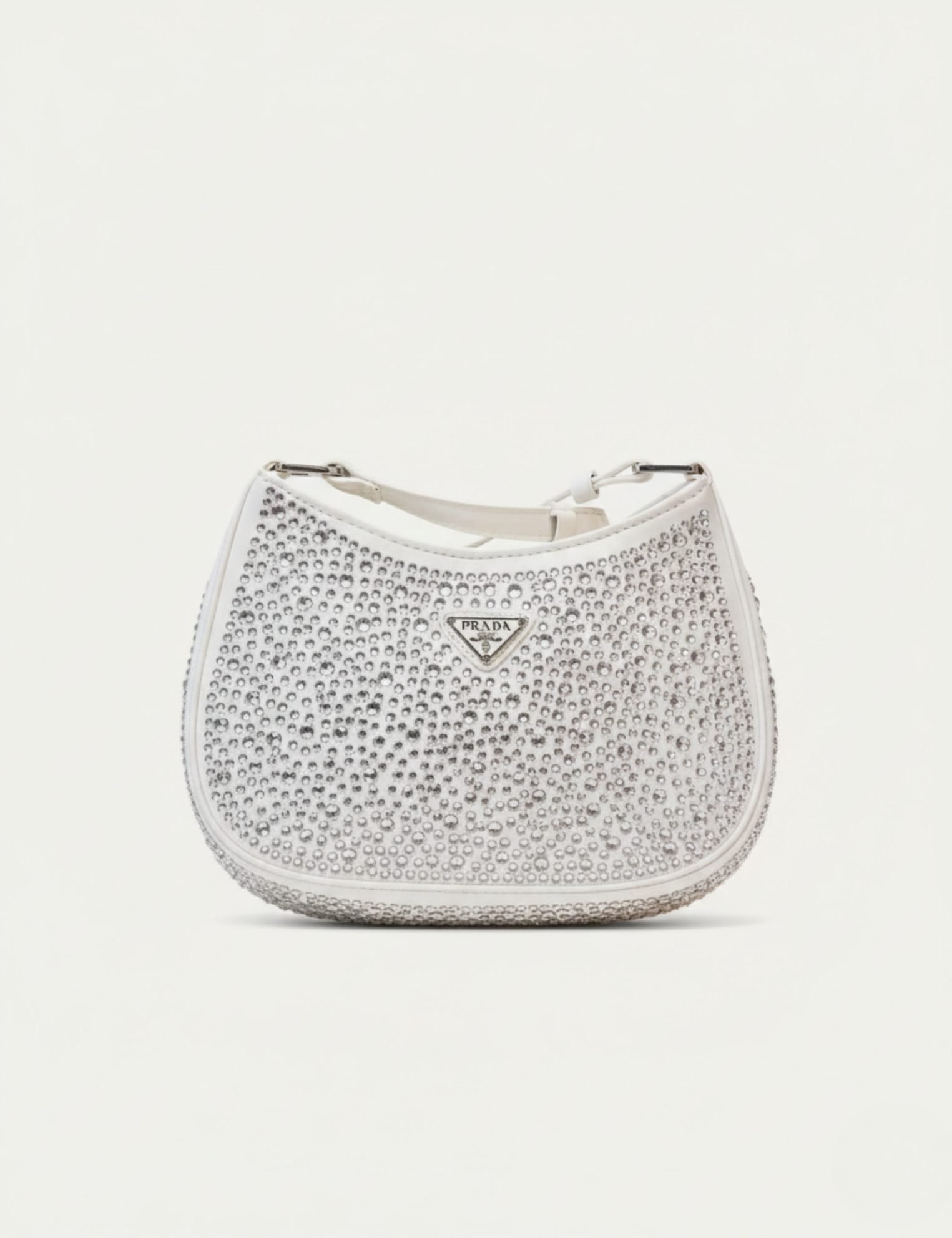 Sparkle day or night with the iconic Re-Edition 2000 Mini Bag. Fully covered in brilliant crystals for a dazzling effect, this bag features the signature triangle logo and a sleek woven shoulder strap. Perfect for carrying your essentials with a touch of luxury and glamour. Limited stock—secure yours now!