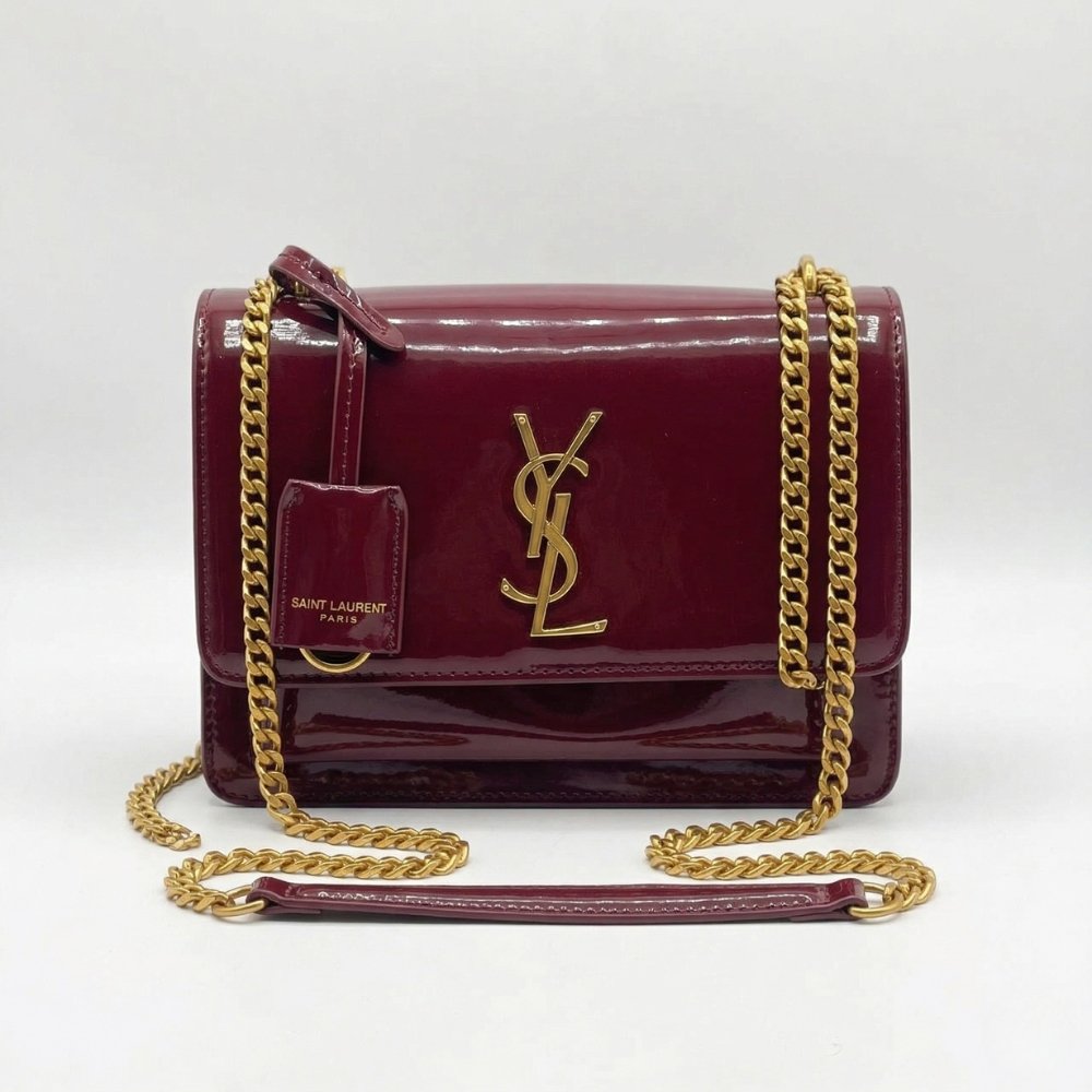 Elevate your evening ensemble with this stunning patent leather flap bag featuring radiant gold-tone chain hardware. The sleek, structured silhouette offers timeless sophistication while providing ample space for your daily essential items.