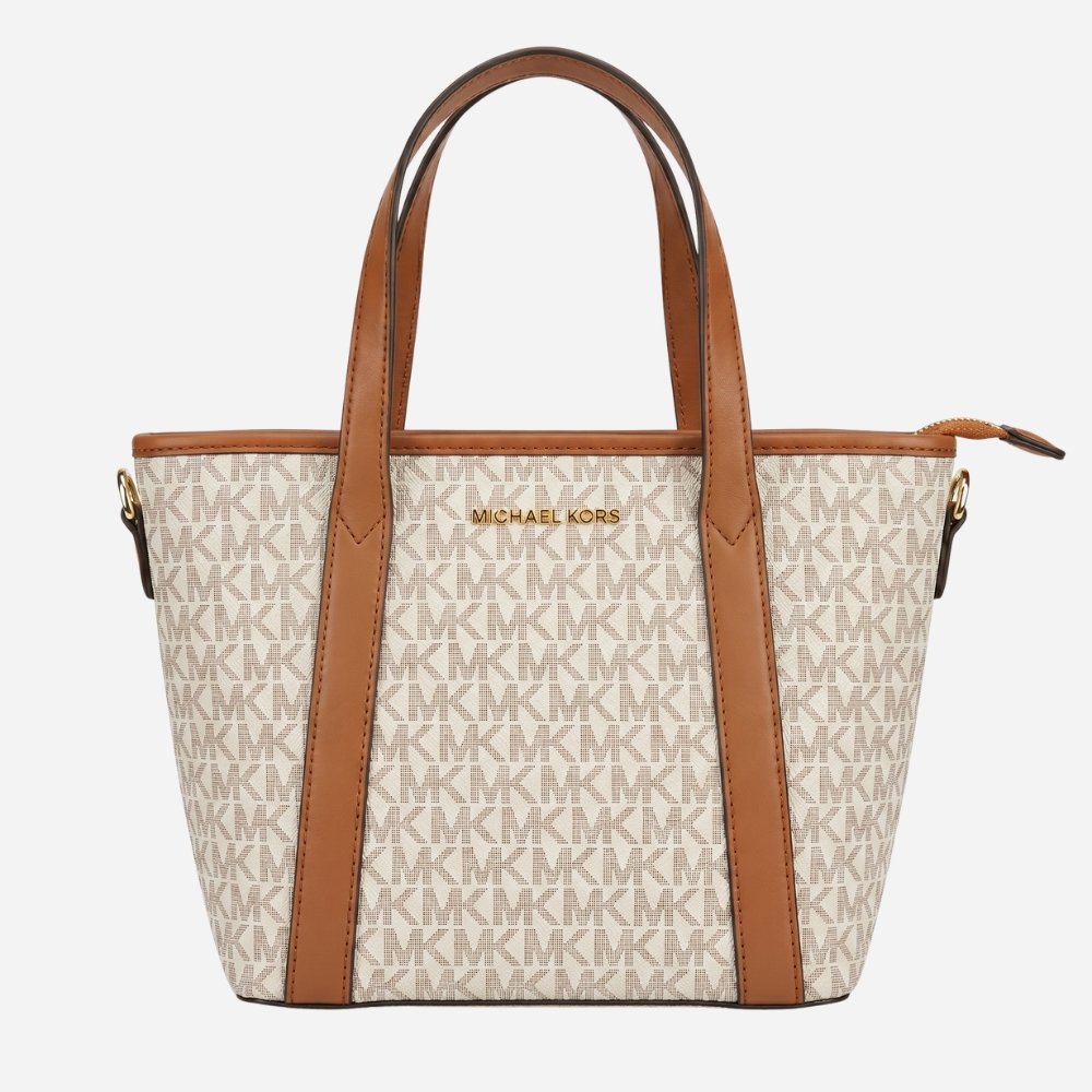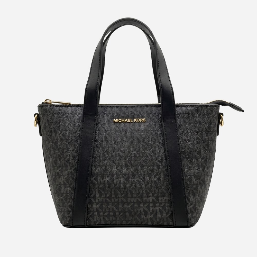 Crafted with precision, this tote features a durable coated canvas exterior adorned with the signature logo motif. The body of the bag is reinforced with smooth, contrasting black or brown leather trim and sturdy handles. Gleaming gold-tone hardware provides a luxurious accent, from the ‘MICHAEL KORS’ logo lettering to the durable top zipper. This build ensures longevity and maintains its shape.
